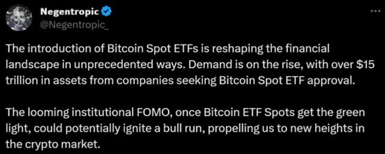 链上数据分析公司Glassnode的联合创始人Yann Allemann发推表示,目前正在申请比特币现货ETF的公司,其总资产管理规模已经超过15万亿美刀!这可不是一个小数目,一旦比特币现货ETF获得批准,机构投资者们可能会蜂拥而至,引发一轮牛市,将加密货币市场推向新的高度。