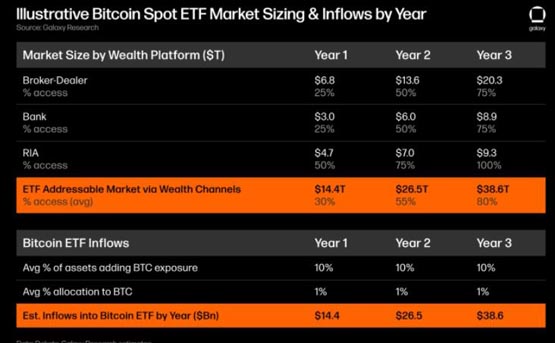 该报告预计,美国现货比特币ETF推出后,第一年的潜在市场规模约为14万亿美刀,第二年约为26万亿美刀,第三年约为39万亿美刀。此外,比特币ETF第一年的资金流入量将达到144亿美刀,第二年增至265亿美刀,第三年将增至386亿美刀。