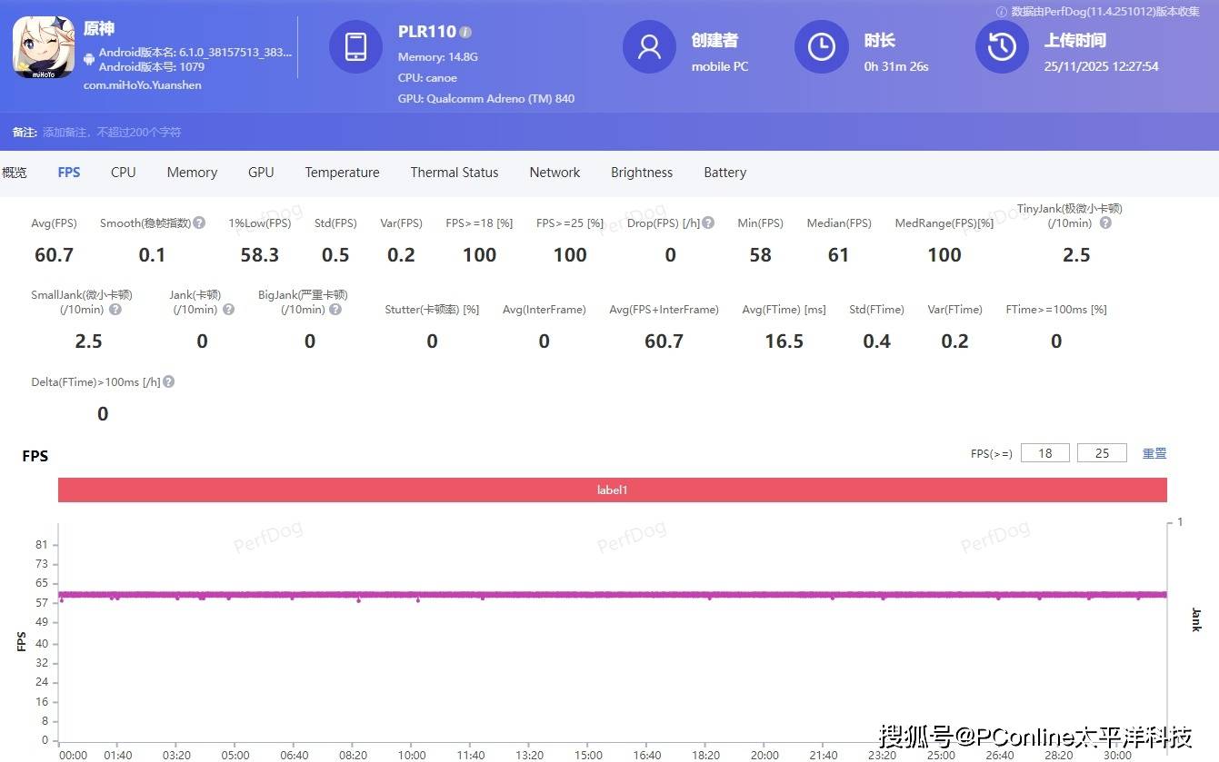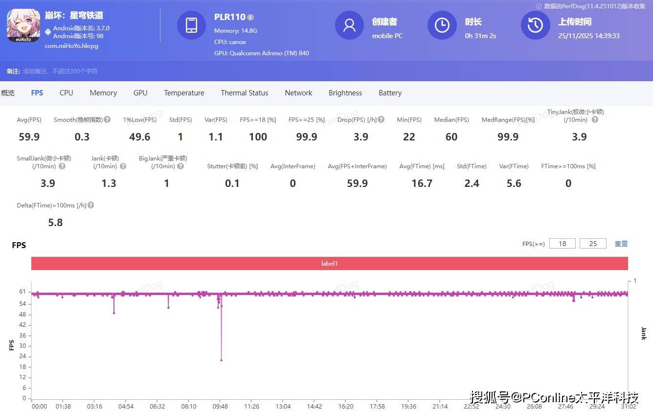 《原神》开启最高画质+60帧模式,在须弥新地图连续跑图半小时后,平均帧率 60.7帧,测试全程没有出现一次掉帧。平均功耗也仅为3.5W,机身最高温度为38.4℃。