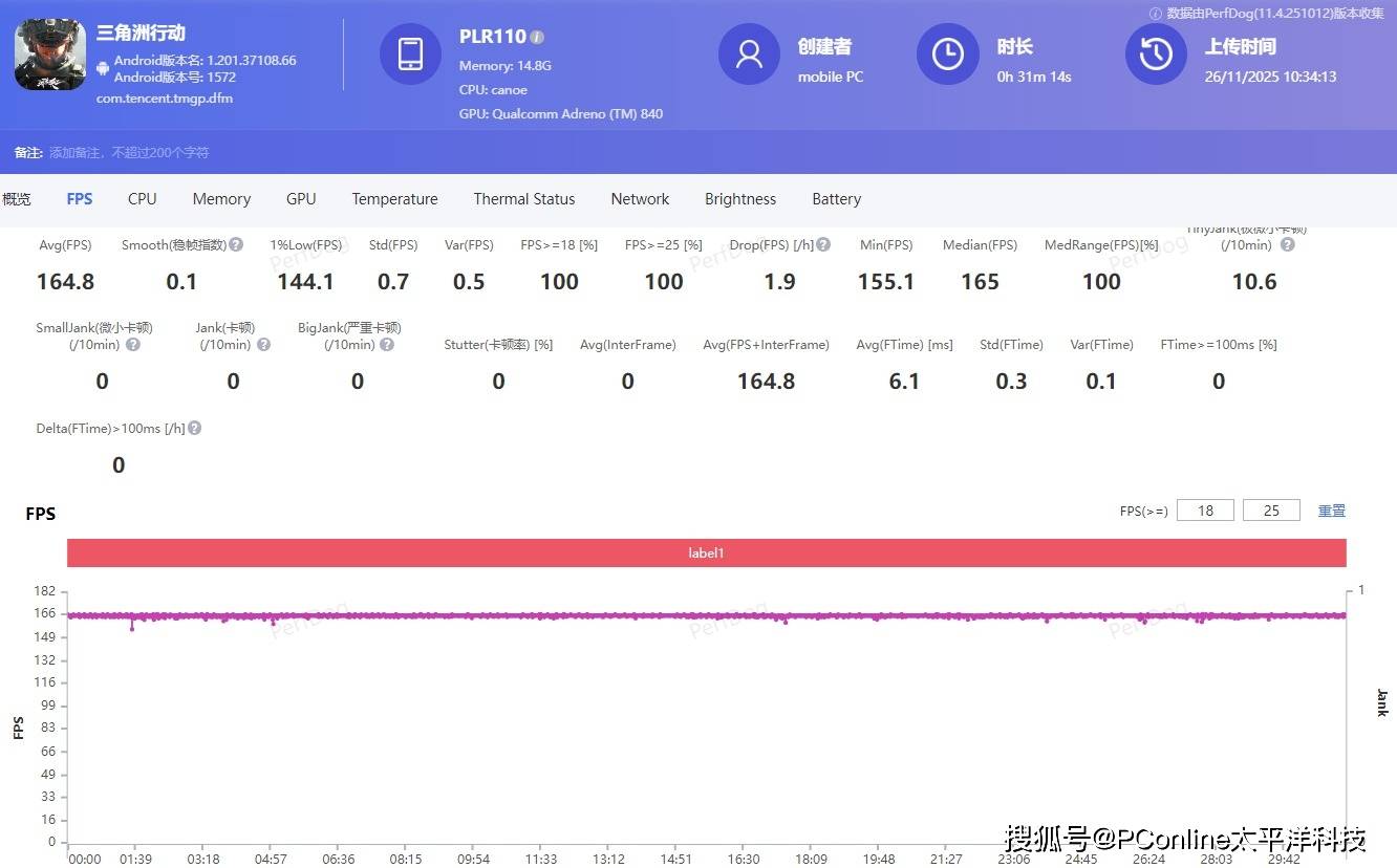 经过我们的实测,运行半小时165帧的《三角洲行动》平均帧率达到了164.8帧,从帧率图大家也能感受到,完完全全就是在满帧运行游戏。测试平均功耗为4.4W,而机身最高温度仅为39.4℃,这个发热对于握持的影响基本可以忽略不计。体验165帧游戏的直观感受就是,搜集物资、开镜扫射、撤退奔跑等一系列操作响应更快更迅捷,且游戏画面几乎没有拖影。