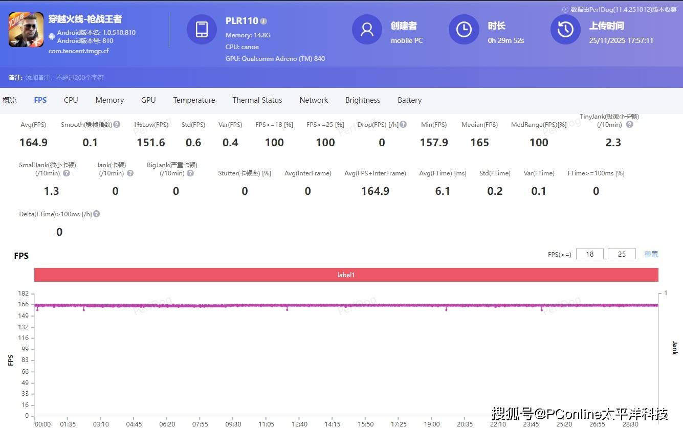 而同样支持165Hz的《穿越火线》手游,游玩半小时后的平均帧率来到了164.9帧,平均功耗3.8W,机身最高温度仅为38.2℃。可以看到不论是帧率、功耗还是发热,一加 Ace 6T依旧延续了无限满帧的出色游戏体验。