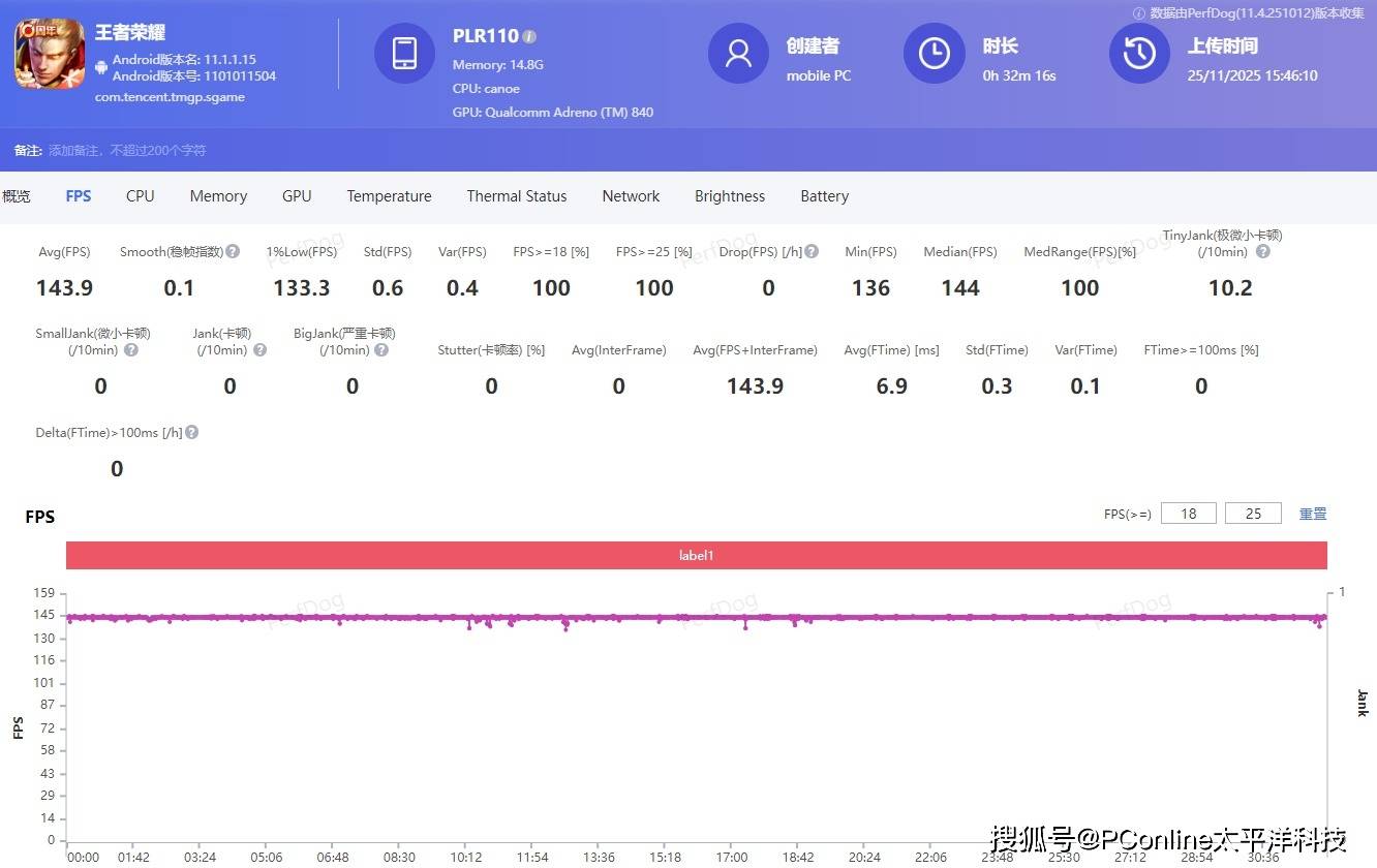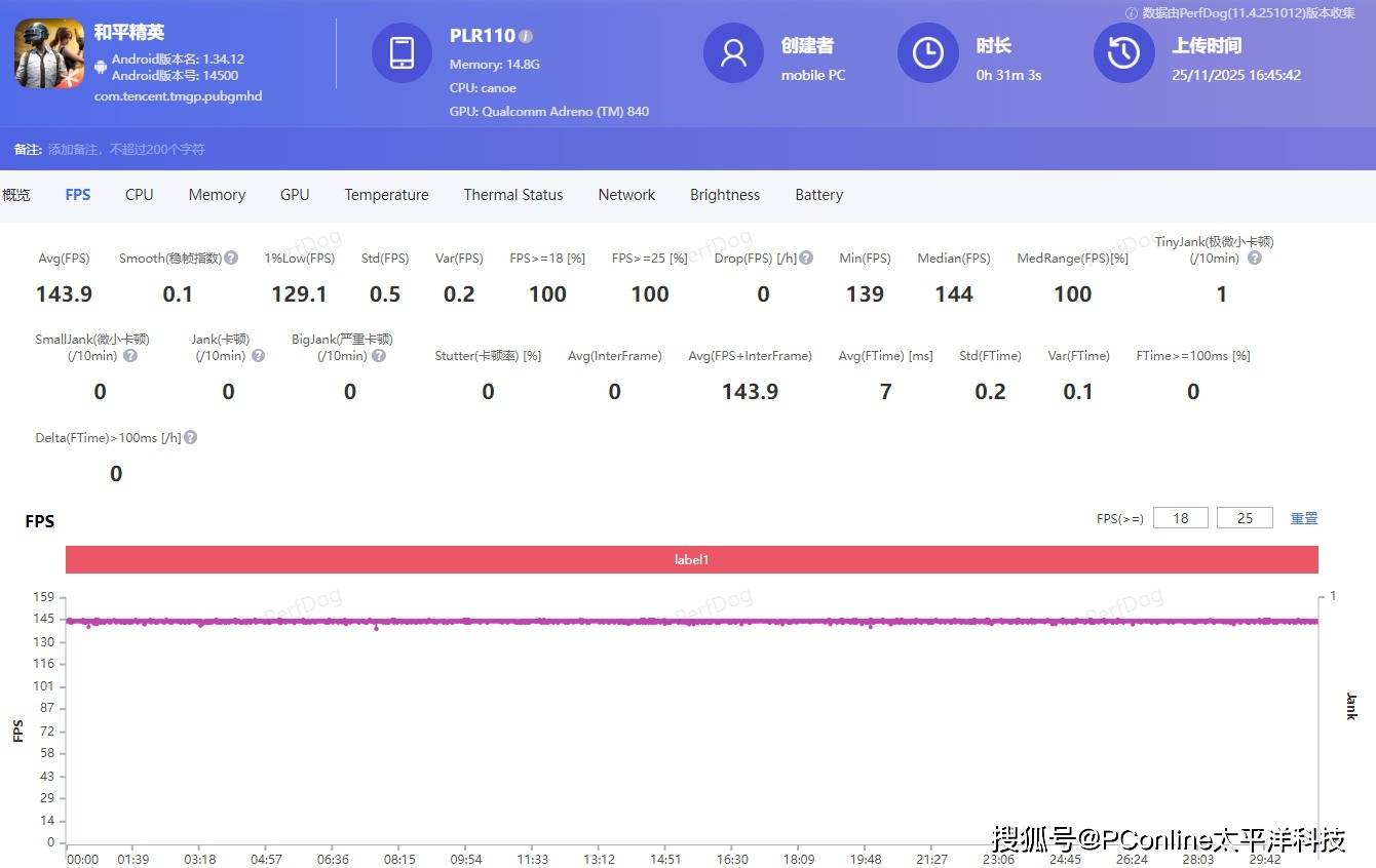 我们也测试了另一款同样适配144帧画面的《和平精英》,半小时游戏结束后平均帧率也高达143.9帧,1%Low帧达到了129.1帧,这意味着在游戏中的跑毒、刚枪等关键场景,一加 Ace 6T的操作响应会更迅捷,画面表现更流畅,不会因为帧率波动而影响操作的体验。
