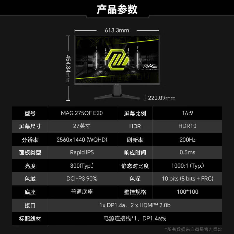【太平洋科技快讯】微星近日推出 MAG 275QF E20 显示器,采用 27 英寸 2K Fast IPS 面板,峰值亮度 300 尼特,支持三年免费上门以换代修。