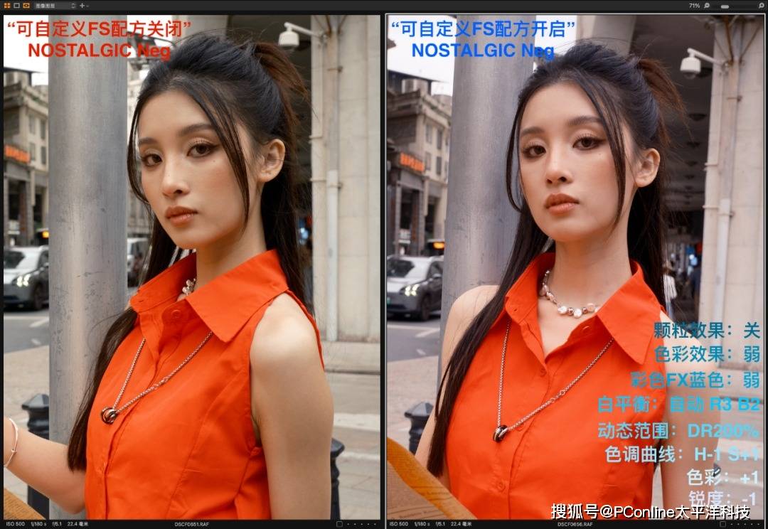 左侧为“富士胶片模拟NOSTALGIC Neg”,右侧是在“琥珀高光的基础上开启FS配方调整后的新胶片模拟”