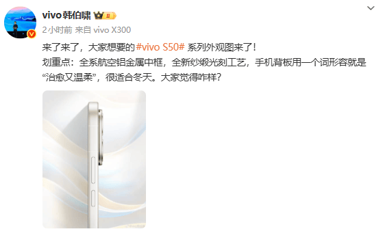 【太平洋科技快讯】11 月 27 日消息,vivo 产品经理韩伯啸今日公布了 S50 系列的侧边外观图,新机全系采用航空铝金属中框与全新纱缎光刻工艺。