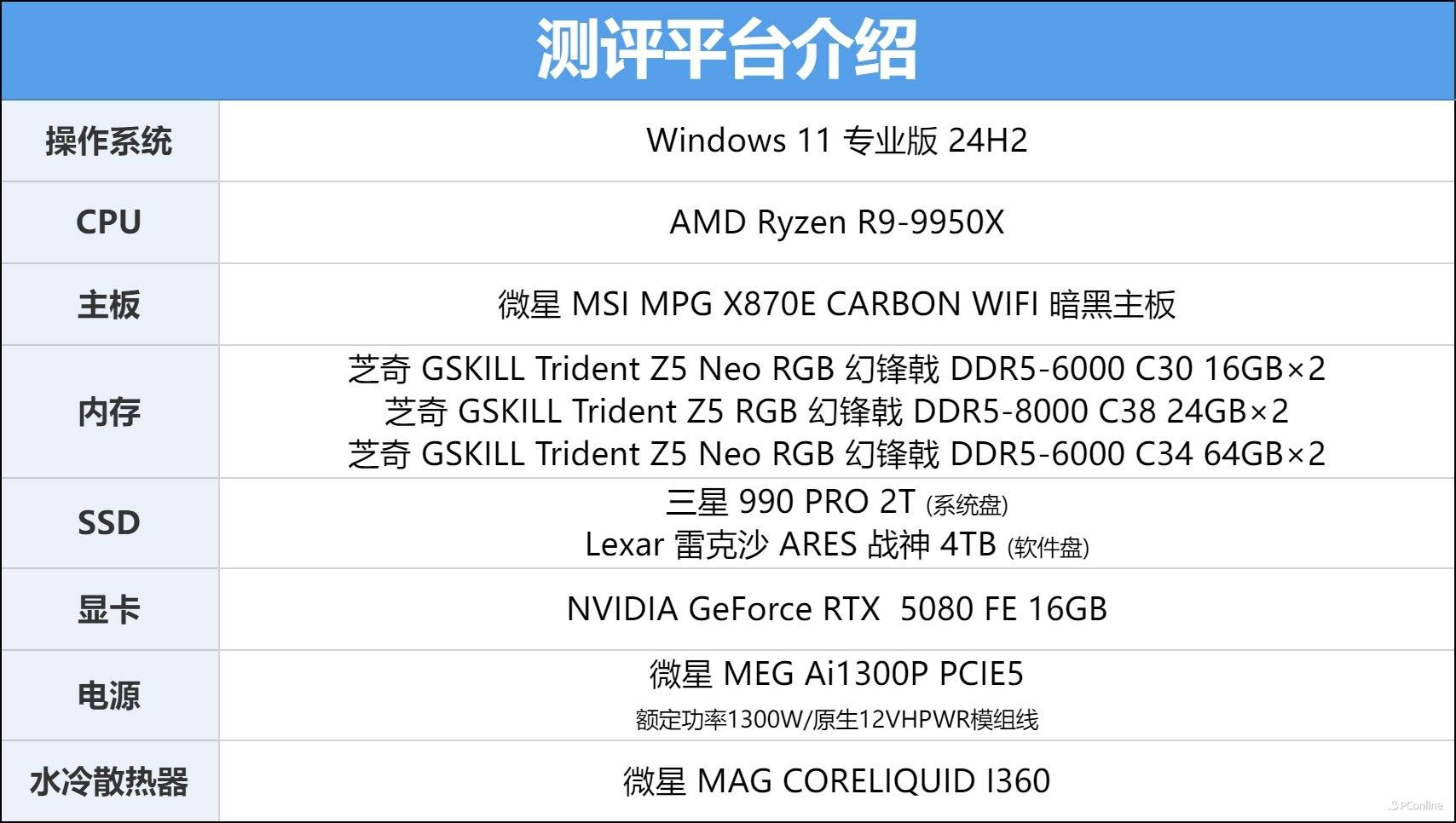 为了最大限度地消除系统瓶颈并放大内存性能的差异,我们选用了目前的AMD消费级旗舰平台进行测试。处理器方面,采用了AMD Ryzen 9 9950X以模拟高端用户的实际使用环境;