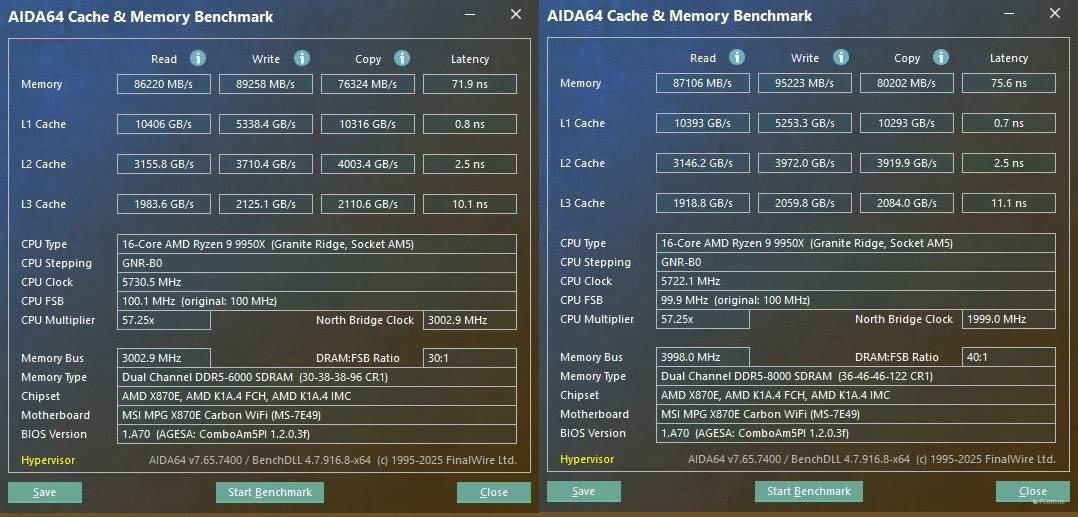测试数据显示,32GB A-die内存从6000MHz提升至8000MHz后,读取带宽竟然几乎没有提升(从86.6 GB/s微增至87.1 GB/s)。这意味着在32GB容量下,单纯拉高频率遭遇了严重的边际效应递减。虽然写入速度提升到了95 GB/s,但延迟却从71.9ns恶化到了75.6ns。花费巨大精力上8000MHz,却换来了几乎相同的读取带宽和更高的延迟。