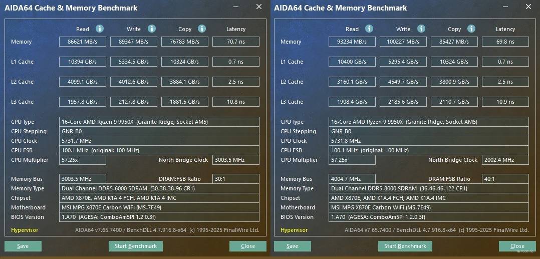 相比之下,48GB M-die展现了惊人的扩展性。在8000MHz下,它跑出了93.2 GB/s的读取和突破天际的100.2 GB/s写入带宽,显著超越了32GB组。更令人震惊的是延迟表现:48GB组在8000 C36下的延迟仅为69.8ns,甚至比它自己在6000 C30下的70.7ns还要低(也低于32GB组)。这证明了新一代24Gbit颗粒在高频下的电气性能极为优异,能更好地消化高频带来的红利。