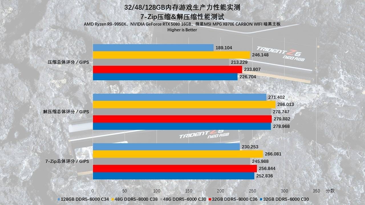 而128GB内存受限于6000MHz频率和相对宽松的时序,在压缩测试中垫底(189 GIPS),如果你处理的是数据搬运密集型的任务,那目前来看,频率依然是硬道理。