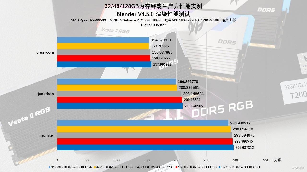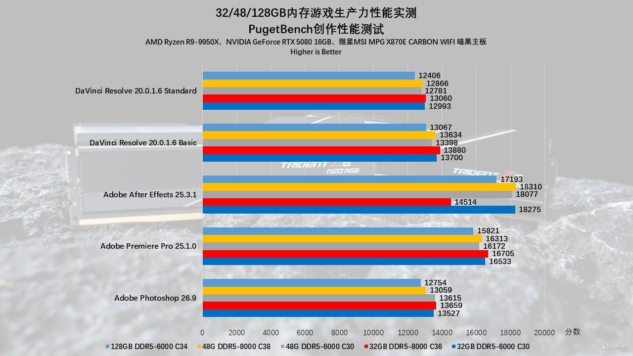 然而,在After Effects这类涉及大量图层合成、内存预览缓存的复杂场景中,剧情发生了惊天反转:48GB DDR5-6000 C30以18310的高分傲视群雄,而32GB 8000组却跌至14514分。这充分说明,对于复杂的合成类工作流,1:1同频模式下的极低延迟(C30时序)配合48GB的中等容量,其收益远高于单纯拉高频率却牺牲时序的8000MHz方案。至于128GB组,虽然受限于C34时序导致跑分略低,但它是唯一能保证在8K项目或超长特效合成中不爆显存、不崩溃的“安全底线”。