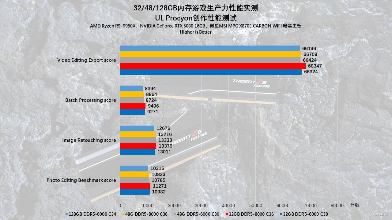 对于依赖线性数据流处理的任务,如Premiere Pro的视频导出、Photoshop的滤镜批处理以及Lightroom的照片转码,高频优势明显,32GB DDR5-8000 C36凭借高带宽拿下了各项测试的榜首,特别是在UL Procyon的视频编辑导出分中,它比128GB组快了约3%。