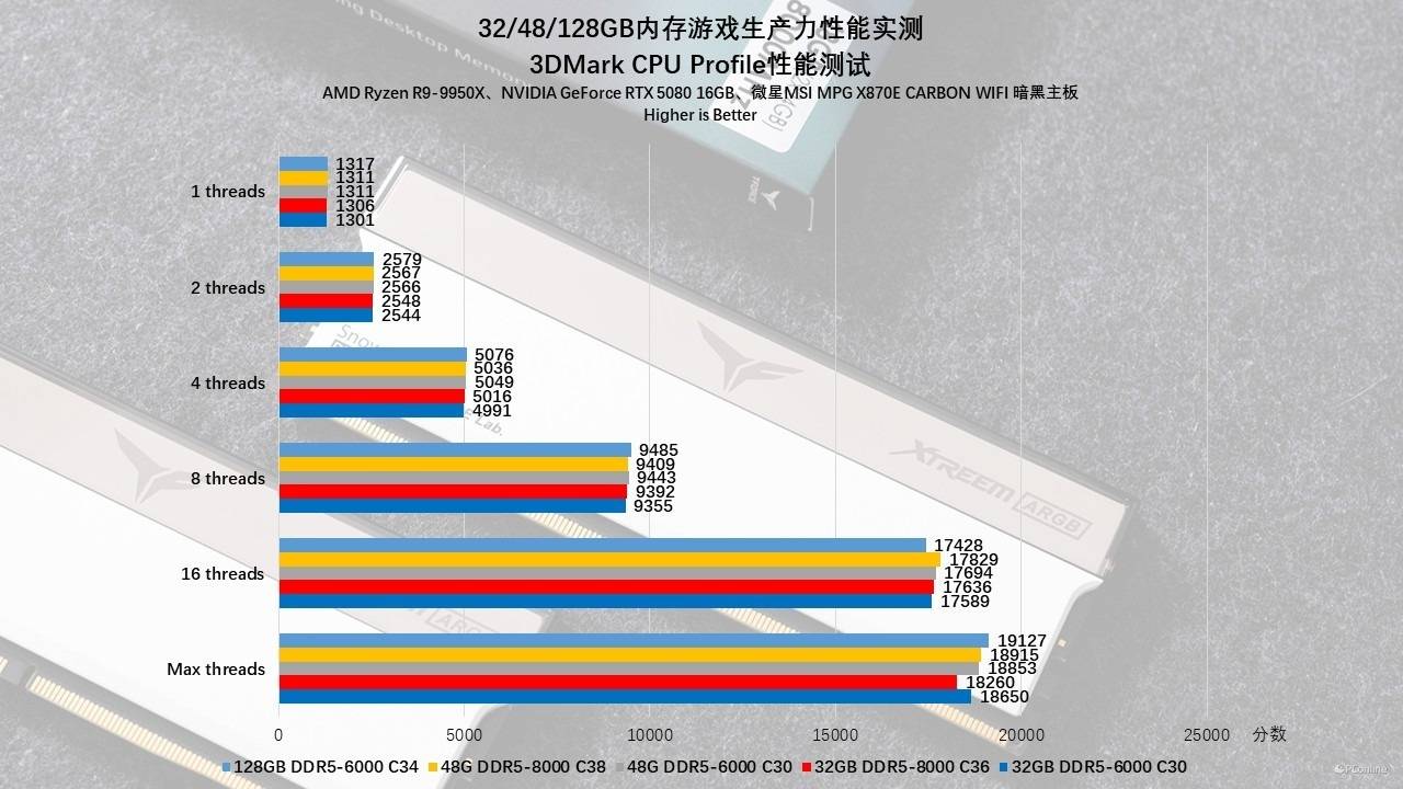 而在CPU Profile测试中,似乎呈现了“容量制胜”定律,得分随容量阶梯式上涨。在Max Threads这种榨干CPU算力的场景下,128GB (19127分) > 48GB (18915分) > 32GB (18650分),这也进一步说明,在涉及全核心满载的复杂物理模拟或多线程计算任务中,增加内存容量能显著减少数据交换的等待时间,其带来的性能收益远超单纯拉高频率。