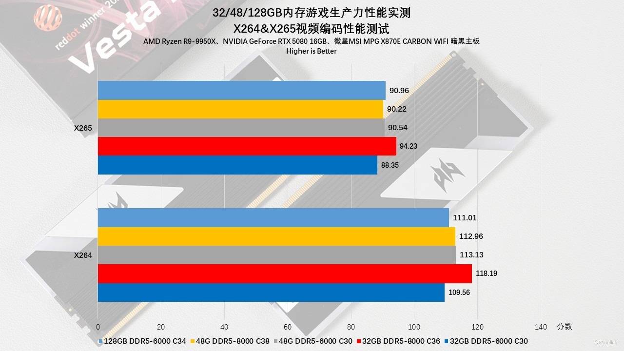 在3D渲染(Blender、V-Ray)与视频编码(X264/X265)的对比测试中,也有这种情况出现。例如视频编码本质上是一个极度吞噬带宽的过程,测试数据显示,无论是X264还是X265编码,DDR5-8000组都稳稳压制了6000组,提升幅度在4%-8%之间,这是高频内存最高光的时刻。