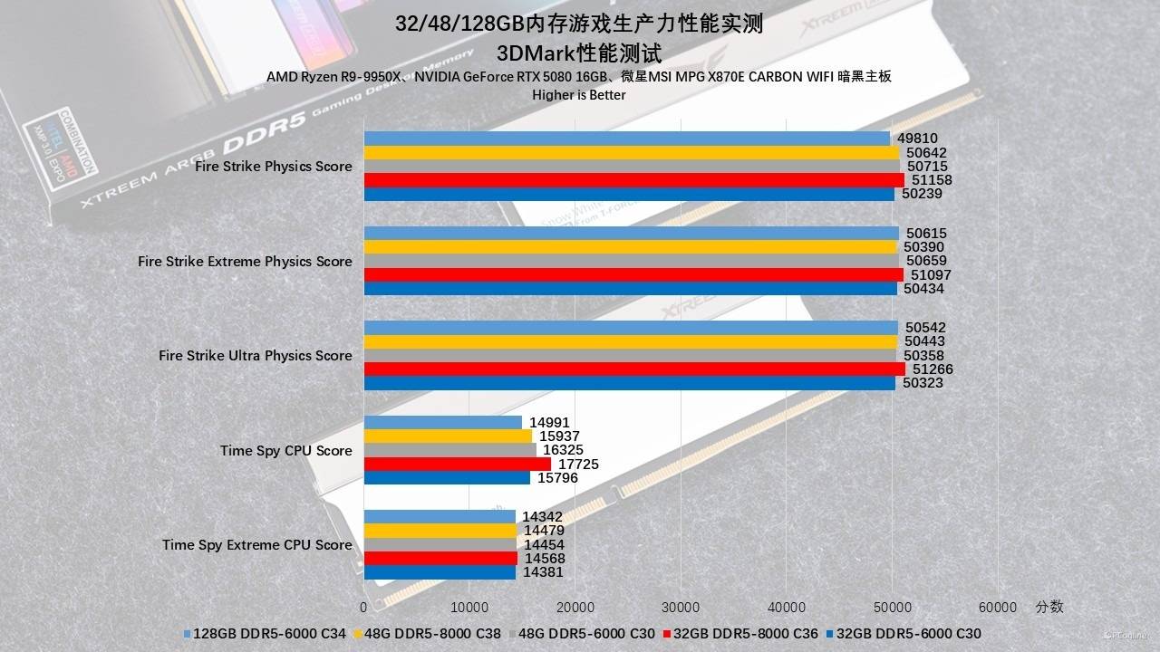 理论性能的最后我们进一步测试了3DMark,在Time Spy与Fire Strike测试中,有一个有意思的现象,那就是时序效率优于单纯的高频带宽:以48GB组为例,在Time Spy测试中,运行在1:1模式且时序更紧的DDR5-6000 C30(16325分)竟然反超了DDR5-8000 C38(15937分)。这有力地证明了在游戏物理模拟这类对延迟敏感的场景下,盲目追求8000MHz而不得不放宽时序(C38)或使用1:2分频,反而会导致性能倒退。而同频下大容量则存在一定优势:对比同为6000 C30的设置,48GB组得分普遍略高于32GB组。如果128GB内存的时序能够再紧一些,分数应该不会比另外两组低。