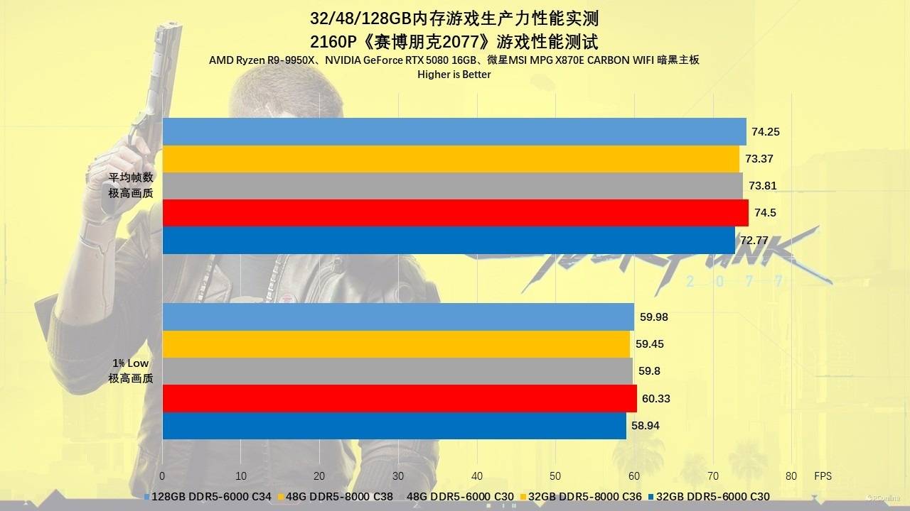 在2160p光追开启的极限环境下,显卡再次成为绝对瓶颈,所有内存组的平均帧都被压缩到了73-74 FPS的区间内。此时,内存规格的差异已属于误差范围。不过128GB还是有优势的,这对于那些喜欢一边开着几十个Chrome标签页查攻略、一边运行4K光追游戏的重度用户来说,128GB提供的“情绪价值”和稳定性远比那1-2帧的波动来得重要。