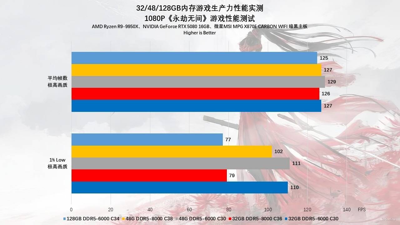 当分辨率提升至1440p,CPU负载压力减轻,内存排位发生了微妙的变化。48GB DDR5-6000 C30 凭借1:1模式的低延迟优势,在1% Low帧表现上以128 FPS反超了所有对手,甚至高于32GB 8000组的124 FPS。这进一步印证了在中等负载下,Ryzen 7000/9000平台对时序、延迟的敏感度远高于带宽。至于128GB,虽然平均帧能咬住大部队,但在1% Low帧上还是显露疲态,仅为125 FPS,不过对于非电竞玩家来说,128GB显然是为工作准备的,这完全在可接受范围内。