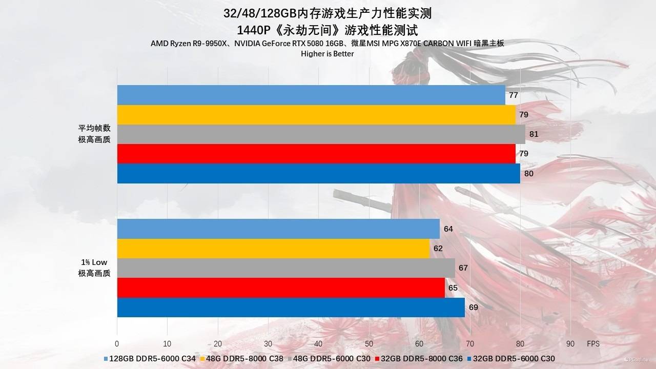 第二款网游我们测试的则是《永劫无间》,测试数据显示,在1080p极高画质下,48GB DDR5-6000 C30 凭借1:1模式的低延迟优势,1% Low帧达到了111 FPS,而32GB DDR5-8000 C36 竟然暴跌至79 FPS,跌幅接近30%。这种因1:2分频导致的剧烈卡顿在拼刀博弈中是致命的。