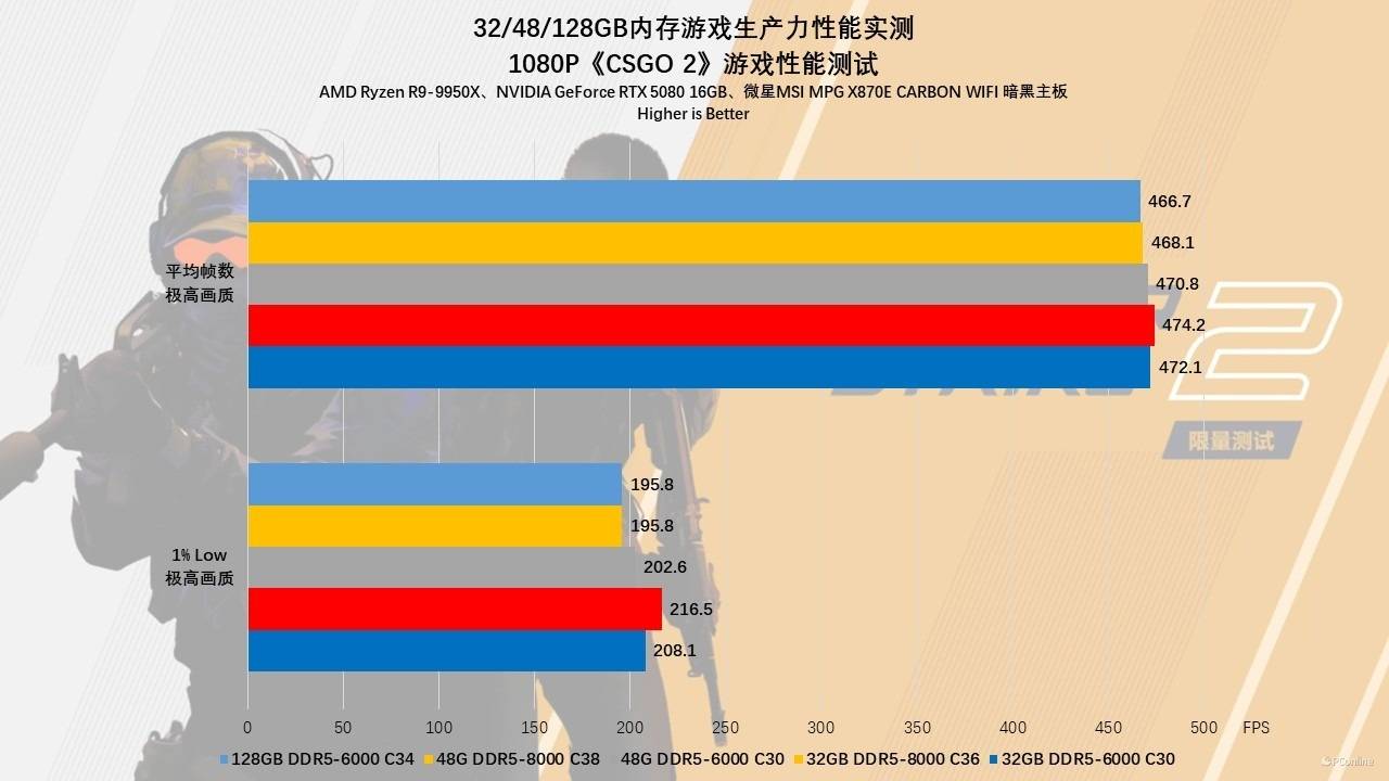 下面则是电竞网游专场,首先出场的是大家耳熟能详的《CSGO 2》,在1080p下,CS 2对延迟的敏感度达到了毫秒级,这是32GB DDR5-8000 C36 的绝对主场。它不仅跑出了474 FPS的超高平均帧,更重要的是在决定生死瞬间的1% Low帧上,达到了惊人的 216.5 FPS,大幅领先其他所有组别。相比之下,48GB 8000组受累于1:2分频,1% Low帧暴跌至195 FPS,总的来说,极致时序配合高频依然是FPS电竞的唯一真神。