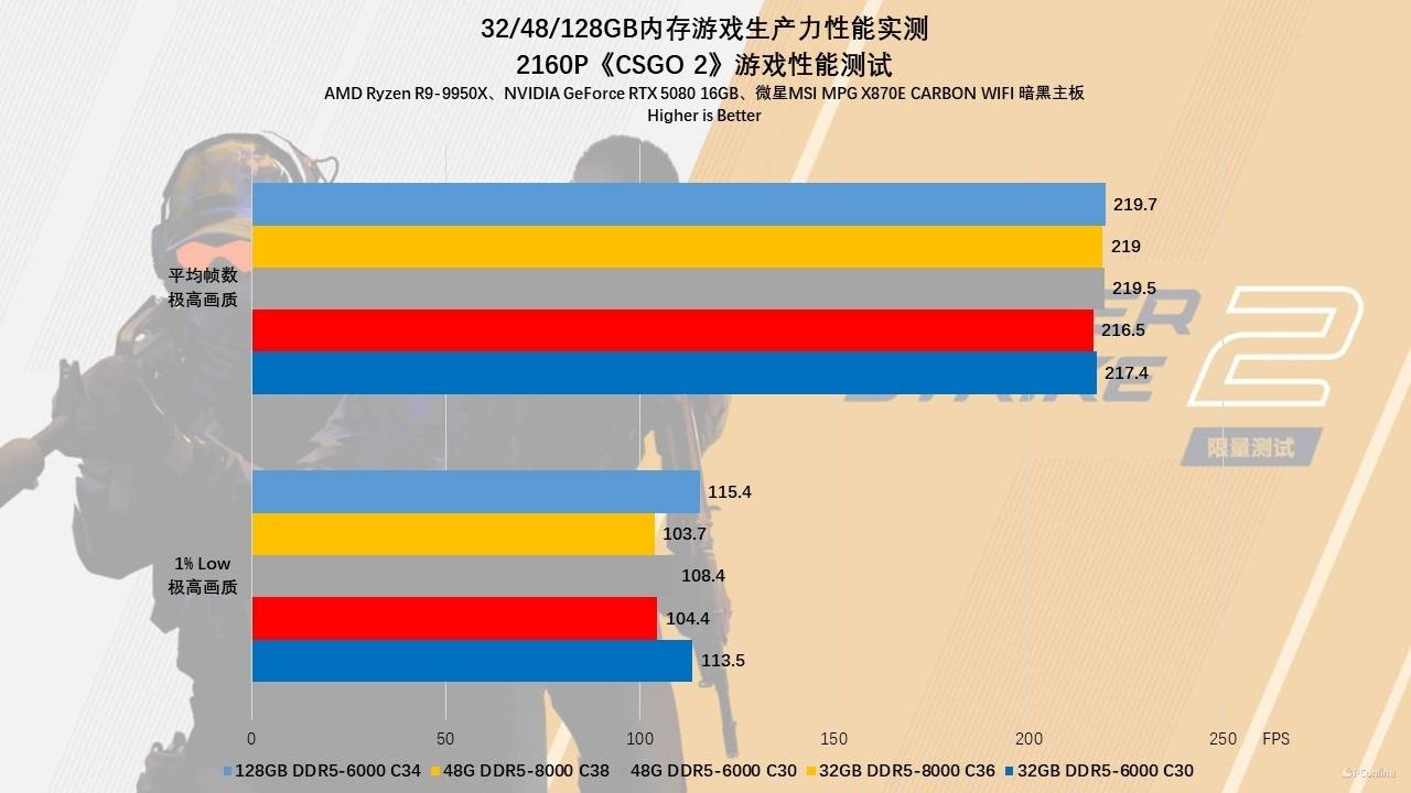 到了2160p(4K)画质,系统负载完全转移至GPU端。有趣的是,即便在这种极限画质下,128GB组的表现依然坚挺,与32GB高频组毫无二致。