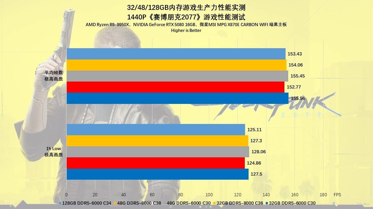 来到1440p(2K)分辨率,显卡瓶颈进一步收紧,内存性能的差异几乎被完全抹平。无论是售价昂贵的8000MHz高频条,还是插满128GB工作站配置,平均帧数均锁定在57 FPS,1% Low帧也稳定在48 FPS左右。