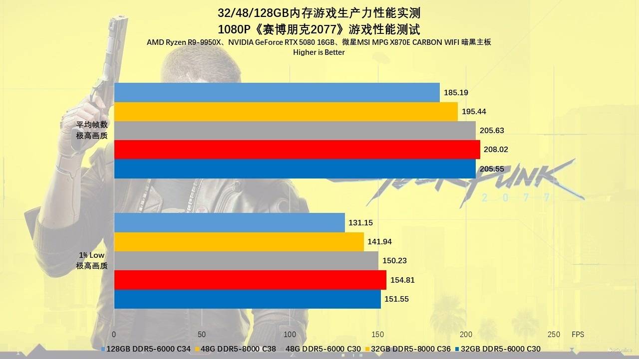 第二款游戏我们测试的是《赛博朋克2077》,在1080p分辨率下,夜之城的复杂车流与NPC逻辑运算让这里成为了检验内存效能的修罗场。32GB DDR5-8000 C36 在此展现了统治力,以208 FPS的平均帧和154 FPS的1% Low帧傲视群雄。然而,48GB DDR5-8000 C38 却遭遇了滑铁卢,其平均帧(195 FPS)和1% Low帧(141 FPS)竟然大幅落后于同容量的48GB DDR5-6000 C30(平均205 FPS / Low 150 FPS)。