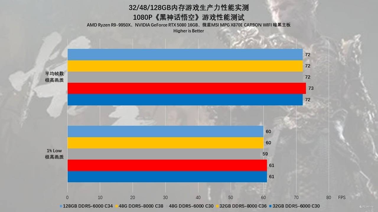首先是3A大作方面的测试,第一个请出的是国产3A之光《黑神话:悟空》。在1080p极高画质下,这款虚幻5引擎的大作展现出了典型的“众生平等”特性。测试数据显示,五组内存的平均帧数惊人地一致,稳定在72-73 FPS之间,说明即便在低分辨率下,GPU依然是主要瓶颈。然而在关乎流畅度的1% Low帧(最低帧)上,32GB DDR5-8000 C36 还是凭借极致的带宽优势,以61 FPS的成绩略微领先于48GB 6000组的59 FPS。这说明在极度压榨显卡的场景中,极高频内存对缓解偶尔的数据吞吐拥堵有一丝微弱的帮助,但并未拉开质的差距。