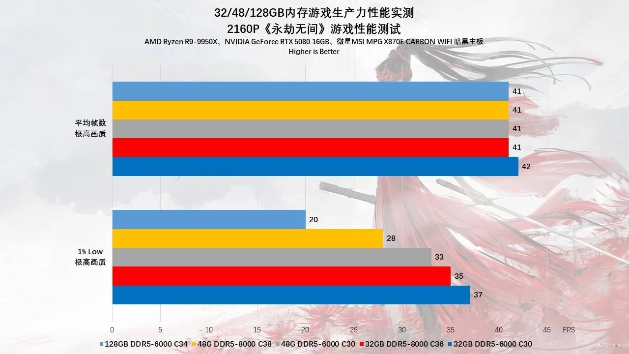 当来到2160p(4K)分辨率时,虽然平均帧数大家都能维持在41 FPS左右(显卡瓶颈),但在1% Low帧上,各组的差异还是比较明显的,其中6000MHz搭配低时序明显要优于高频但相对宽松的时序。因此,对于《永劫无间》玩家,48GB/32GB DDR5-6000 C30 是兼顾流畅与稳定的唯一解。