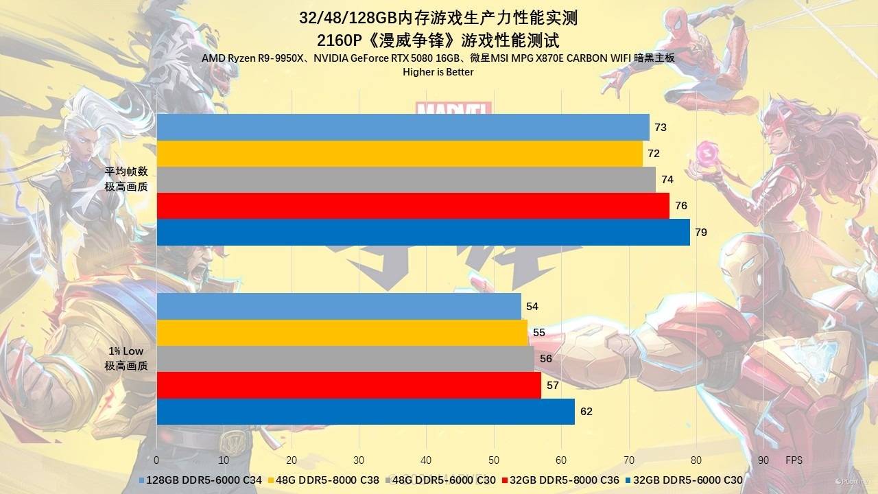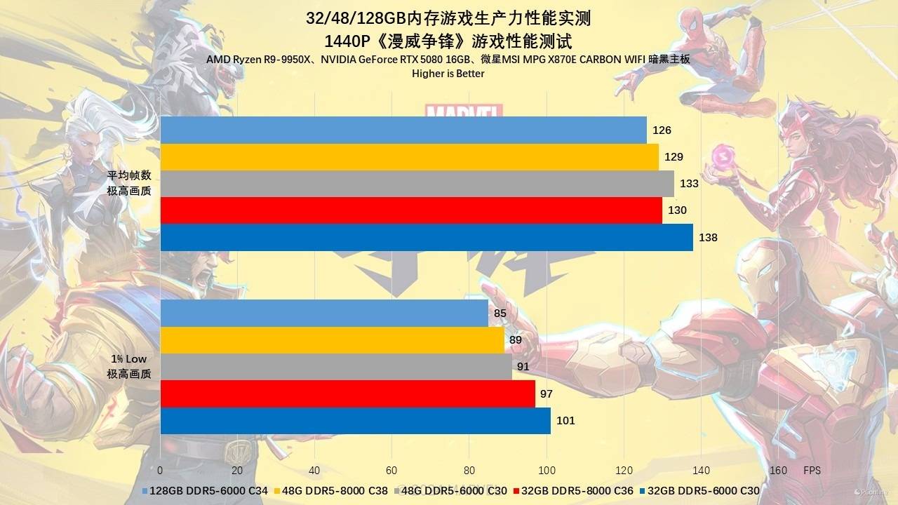 至于另外一款基于UE5打造的网游《漫威争锋》的情况也是比较类似的,在1080P下,同样是甜点频率加低时序为王。而128GB的内存在这里则因为时序较为宽松,因此成绩稍稍落后一些。