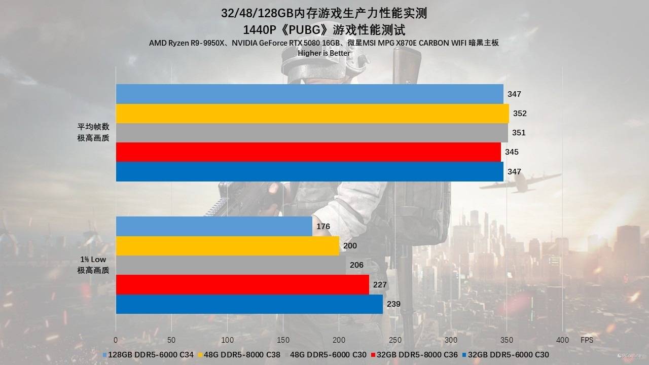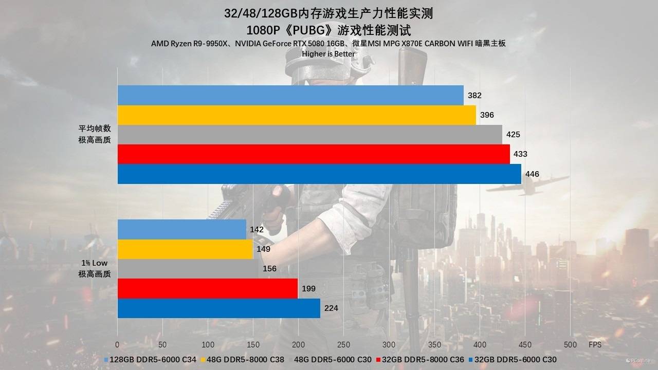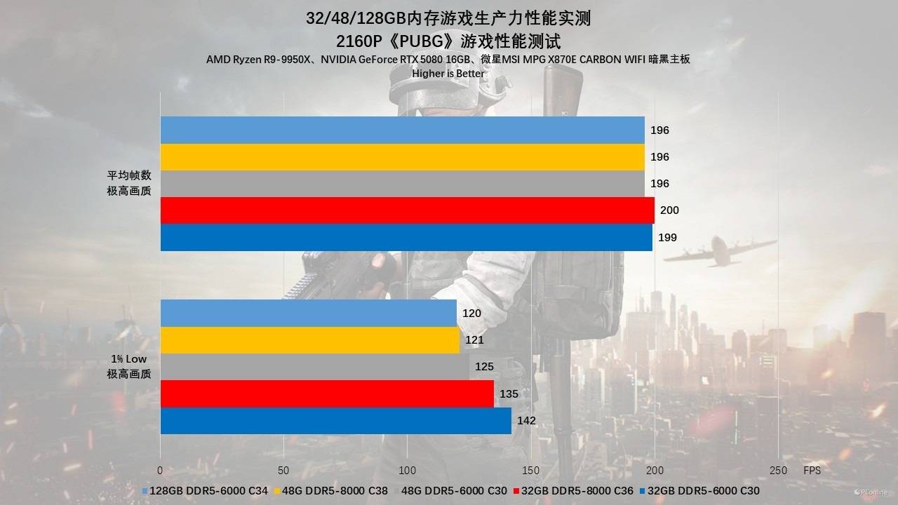 最后一款游戏我们测试的则是《绝地求生》,在1080p分辨率下的测试结果延续了“甜点频率+低时序”的传统定律。其中32GB DDR5-6000 C30的1% Low帧高达 224 FPS,以碾压之势击败了48GB组(156 FPS)和128GB组(142 FPS)。即使是DDR5-8000高频条,在1080p下也只能跑到199 FPS。这证明了在低分辨率下,PUBG对内存时序会更为敏感。