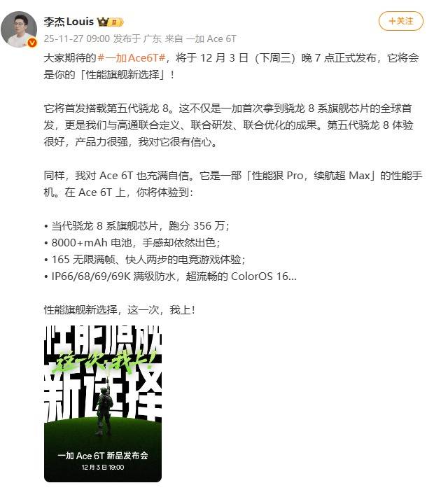 编辑点评:从核心配置到系统优化,一加Ace 6T释放出明显的旗舰野心:首发第五代骁龙8、356万跑分、8000mAh大电池与满级防水,堆料猛烈且指向性鲜明。随着发布会临近,更多细节值得期待。如果一加能在价格策略上保持优势,Ace 6T有望成为年末性能机市场的一颗“强力变量”。