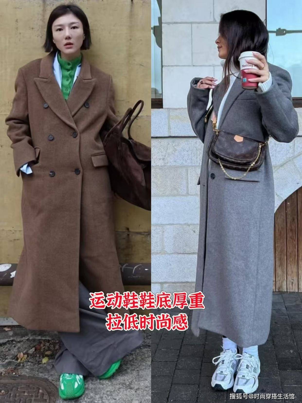其次中年女性穿大衣的时候还喜欢搭配运动鞋,毕竟运动鞋非常的舒适和百搭,简直就是冬天出行最佳选择,但运动鞋是属于休闲风格的鞋子,大衣是属于成熟正式风,选择将它们强行组合在一起的话,整个穿搭就会显得“格格不入”,运动鞋的鞋型厚重累赘,无疑会让整个造型大打折扣,整体时尚感。
