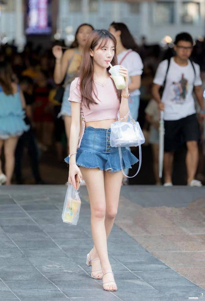 性感穿搭的最关键之处在于尺度,大部分搭配达人都能恰如其分的对性感尺度拿捏准确,比如说这一款粉色短袖搭配上中腰牛仔裙,虽然说是韩国女团的普遍穿搭风格,不过却多了一份俏皮可爱的感觉。