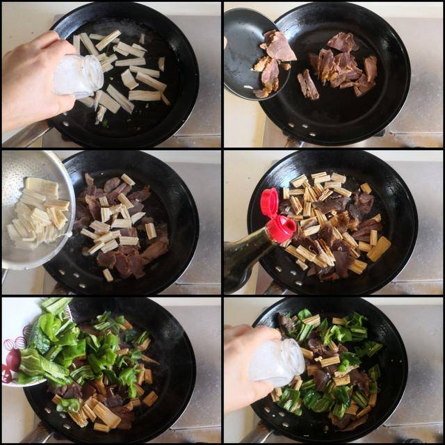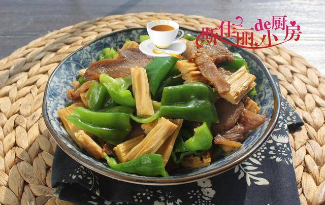 制作过程: 将腐竹提前泡软后切成小段; 卤牛肉和青椒也切成片备用。烧锅水加入1小勺盐, 提前将腐竹放进锅中焯煮2、3分钟后捞出备用; 烧热锅放入适量的油,加入卤熟牛肉片放进锅中翻炒几下,再加入焯好的腐竹放进锅中翻炒两下,加入1勺生抽翻炒上色,再加入青椒片放进锅中翻炒几下, 青椒微微变色后加入少许盐调味,翻炒均匀即可。