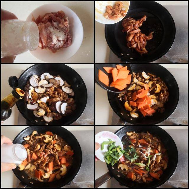 制作过程: 将香菇和青蒜洗净后切成片备用; 鸡大腿剔下骨头后将鸡腿肉也切成片,加入少许盐、生抽、料酒和淀粉等调味料拌均匀腌制3分钟备用; 烧热锅放入适量的油, 将腌制好的鸡腿肉放进锅中去翻炒至变色, 加入准备好的香菇片放进锅中翻炒几下,炒时加入少许生抽翻炒上色, 加入少许胡萝卜片放进锅中翻炒几下,加入少许盐调味,翻炒均匀,最后加入少许青蒜翻炒至变色即可。