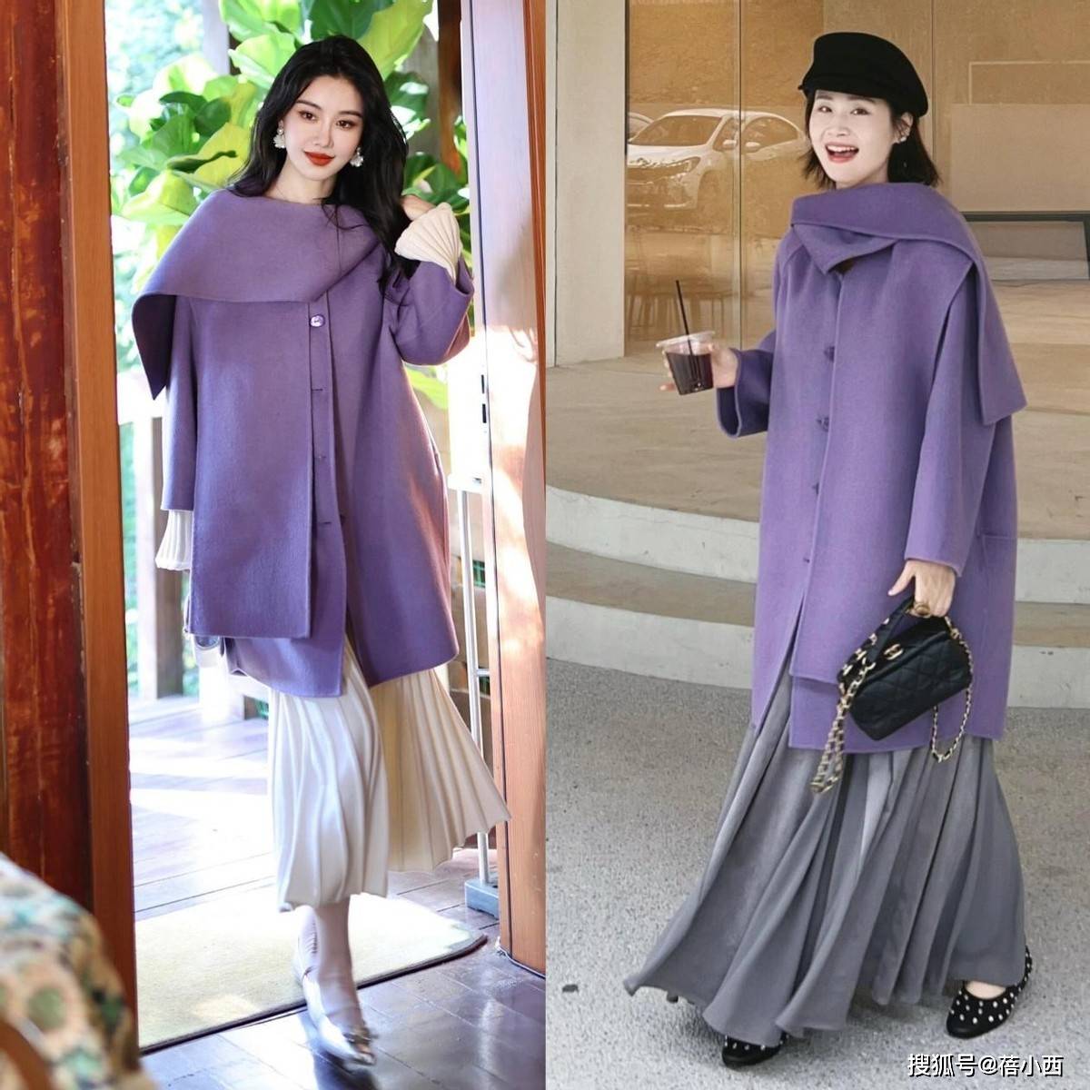选干净色大衣是有小技巧的,冬季想要有一点氛围感,可以尝试这种深紫色的大衣,比黑色更浪漫,搭配百褶半身裙,高级感直接拉满。