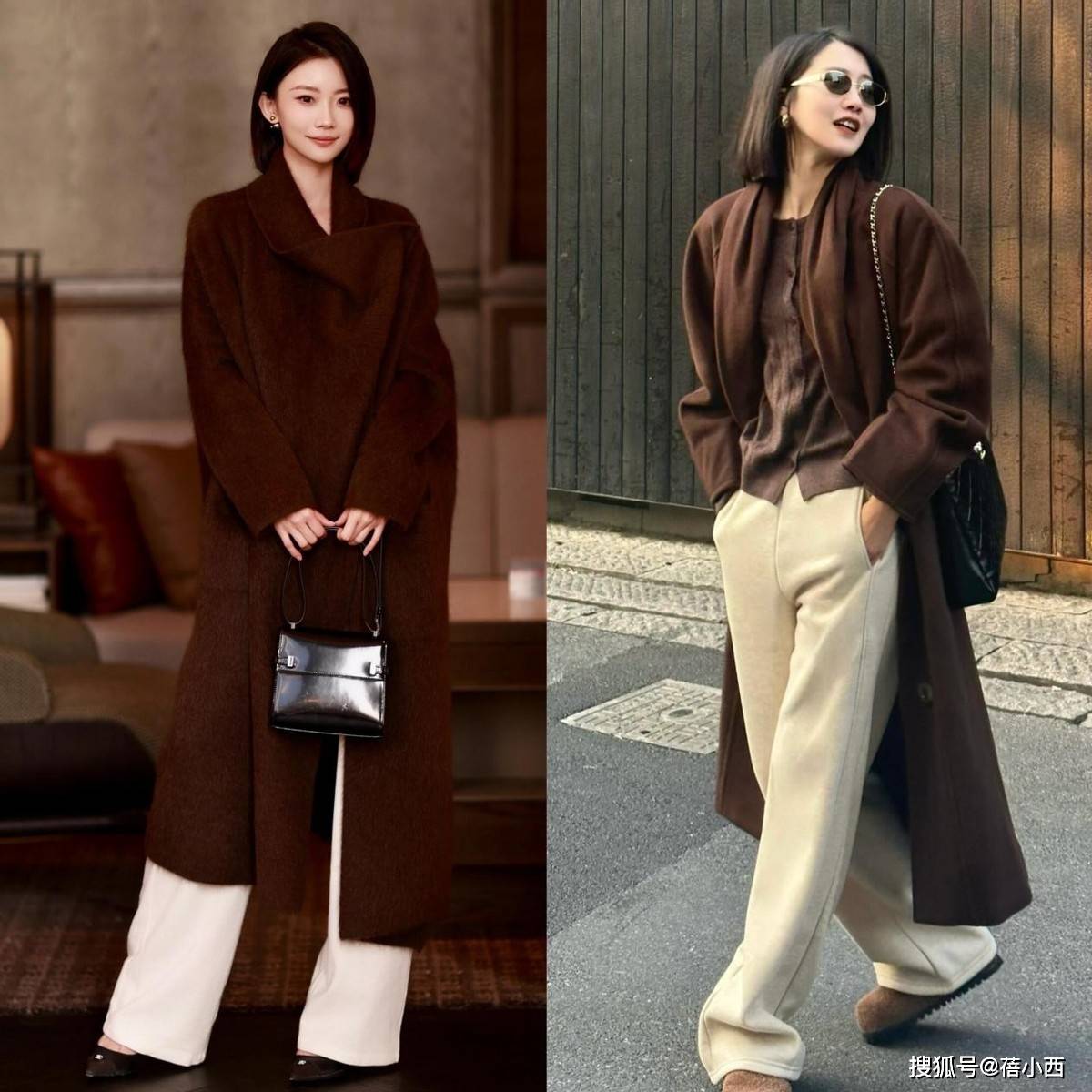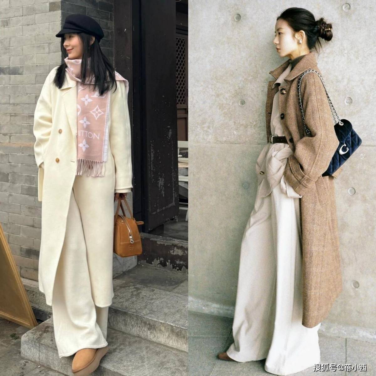如果想要通过大衣搭配阔腿裤拉伸比例,那裤子的面料一定要选垂坠感强的,比如毛呢、西装料、雪尼尔,自带质感不贴腿,还能藏住腿粗、腿不直的小缺点,久坐也不容易皱,穿出门利落又显高级,其次是版型别选太拖沓的,裤长盖过脚踝1-2厘米刚好。