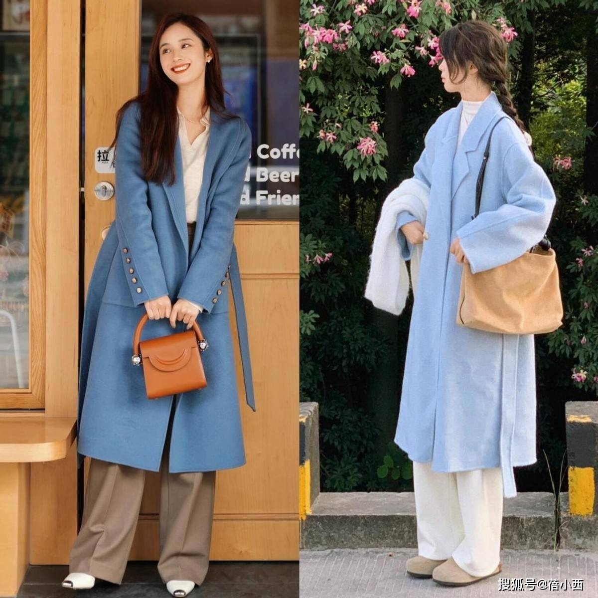 冬季虽然沉闷,但姐妹们可以用浅色系单品体现轻盈感,比如蓝色大衣搭配白色的阔腿裤,休闲又舒适,敞开穿蓝色大衣,内搭白色的高领打底衫,整体松弛感拉满还不失高级。
