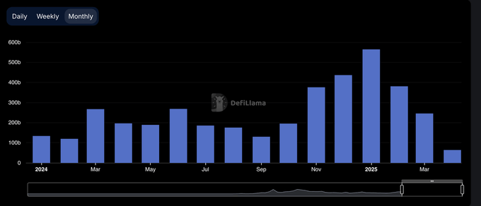 2024年初,DEX交易量在3月和5月表现强劲,但在年中之前逐渐放缓。然而,第四季度情况发生了变化,11月和12月的交易量大幅增加,这一趋势延续到2025年1月,达到了3800亿美元的高峰。然而,这次反弹只是昙花一现。到2月,市场交易量已急剧下降至2450亿美元,35%的急剧下跌结束了持续三个月的快速增长,预示着第二季度将更加谨慎。
