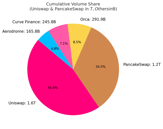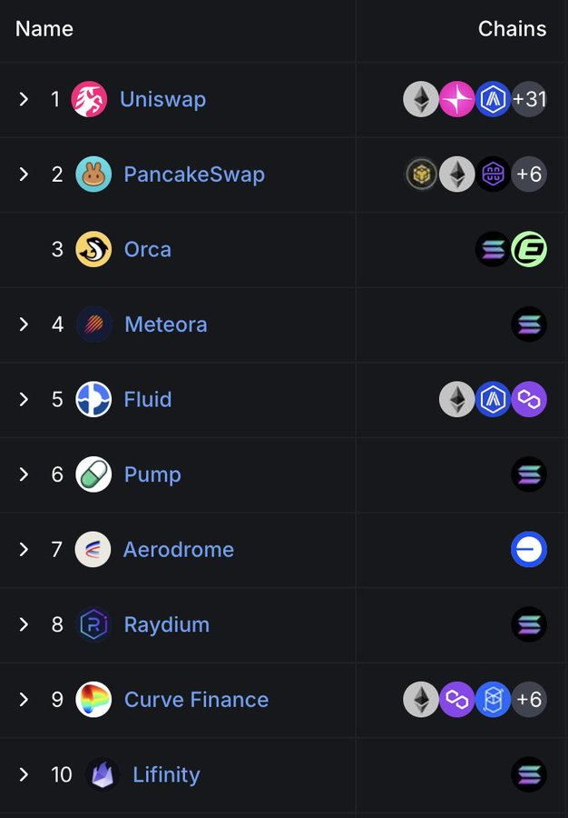 DEX市场仍然高度集中。前十名的协议占据了日交易量的79.5%,而前五名就占据了59.1%。Uniswap和PancakeSwap占据了DEX约40%的交易量,是迄今为止仅有的两家累计交易量突破万亿美元的平台。它们的领先地位得益于先发优势、对多链生态的广泛支持以及深厚的流动性。Uniswap Labs还推出了Unichain,这是一个基于Optimism Superchain构建的以太坊第二层网络,旨在通过原生多链互操作性实现快速、低成本的交易。