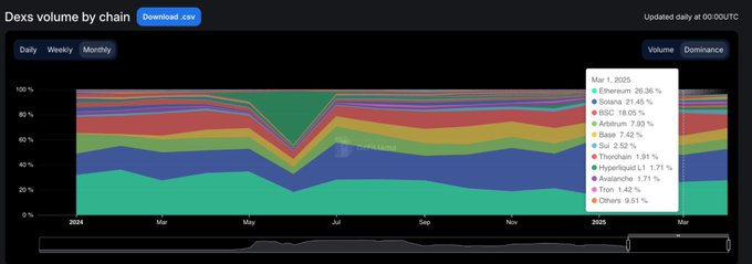 过去15个月清楚地表明,大多数区块链项目能够吸引关注,但只有少数能持续保持吸引力。从2024年1月到2025年3月,链级去中心化交易所的市场份额变化迅速,只有少数项目真正具有用户粘性。Solana取得了最大的突破,在2024年稳步攀升,受TRUMP和MELANIA Meme币热潮推动,于2025年1月达到45.8%的市场份额峰值。但到3月份,其市场份额腰斩至21.5%,不过仍以25.1%的平均占比稳居各公链之首。以太坊则相反,2024年初以约32%的份额开局,2025年1月跌至15.3%,随后在3月反弹至26.4%。Base是最稳健的追赶者,从2024年3月的3%持续增长至12月的12.4%,2025年3月回落至7.4%,期间保持6.6%的平均占比。BNB Chain以14.7%的平均份额保持稳定。Arbitrum开局强劲(16%份额)却后继乏力,至2025年1月已滑落至4.8%。Blast在2024年6月创下42.3%的市场份额峰值后,第二个月就消失不见。各公链的DEX主导地位具有强波动性,最终占据主导地位的公链是实际使用率最高的网络。