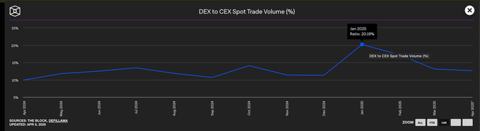 尽管DEX在2025年初出现爆发式增长,但中心化交易所仍在现货市场占据主导地位。即使在DEX交易量达到峰值的1月份,CEX仍占据了总交易量的近80%。尽管中心化交易所的主导地位从2024年初的90%一度下滑至最低点79%,但更广泛的趋势显而易见:DEX虽然持续增长,但CEX仍然是大多数交易者的默认选择。