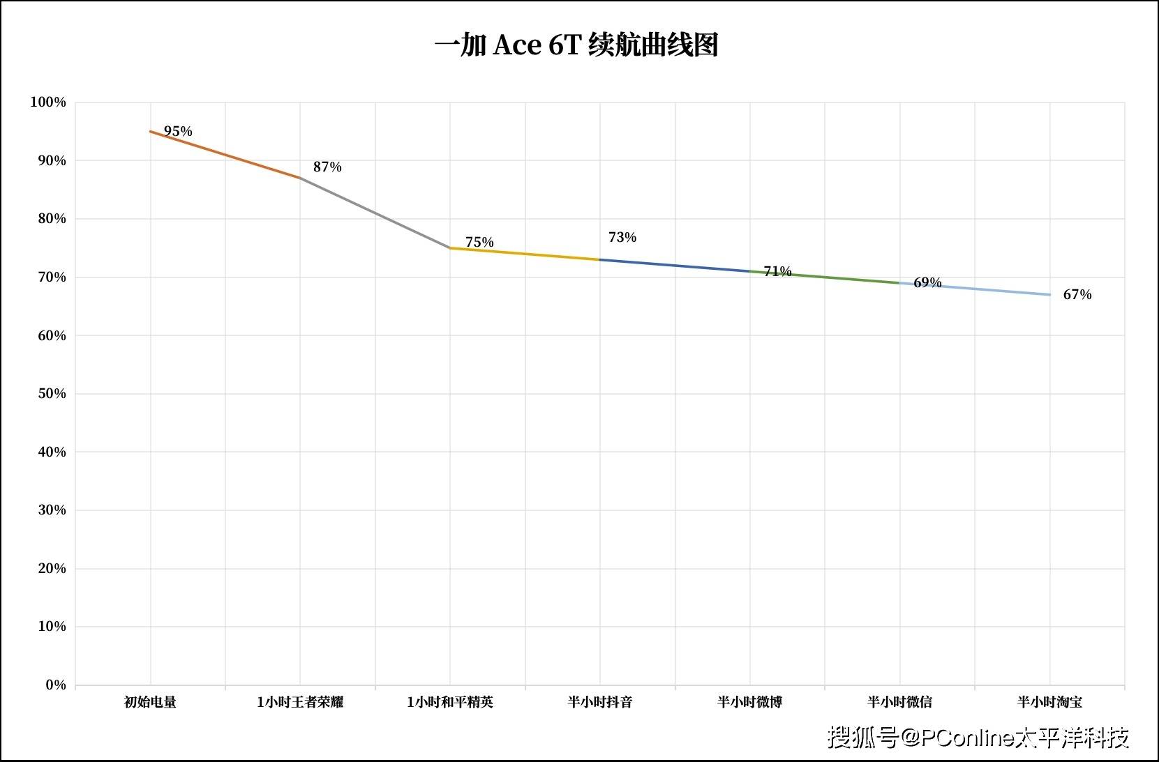 作为核心测试场景,游戏功耗直接反映手机续航硬实力。在《王者荣耀》144Hz极致帧率设置下,连续激战1小时后,电量从95%降至87%,每小时耗电量仅8%;切换至《和平精英》HDR高清+90帧模式,1小时后剩余75%电量,耗电量12%。对比同价位主流机型(多为6000-7000mAh电池),一加 Ace 6T的优势极为明显。