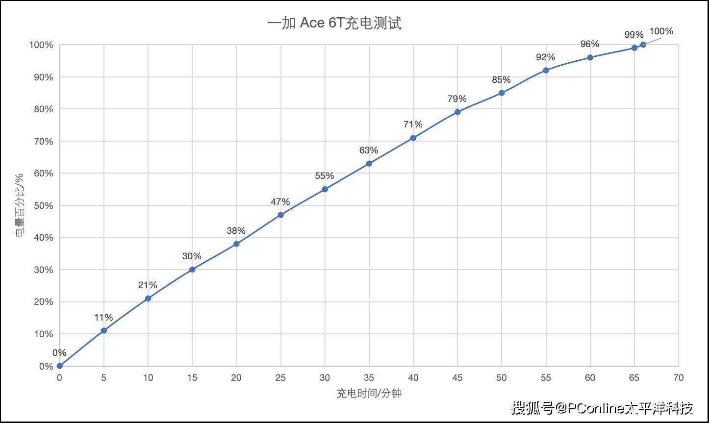 我们从关机状态的0%电量开始充电测试,每5分钟记录一次充电数据:5分钟充至11%,10分钟达21%,20分钟升至38%,30分钟充至55%,最终66分钟完全充满。这意味着,早上起床发现电量告急时,洗漱+早餐的30分钟即可充至半电以上,满足全天通勤、办公的基础需求。即使是从零到满电,也仅需一小时出头,完全适配现代用户的快节奏生活。