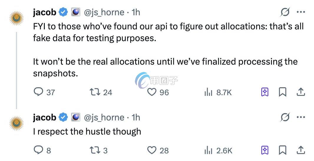 消息一出,社区成员们立刻开始尝试通过 API 查询空投分配情况,但 Zora 联合创始人 @js_horne 却泼了一盆冷水。他在 X 上提醒:“目前大家发现的 API 配额数据都是假的,只是测试用的,真正的分配要等快照数据处理完才会公布。”