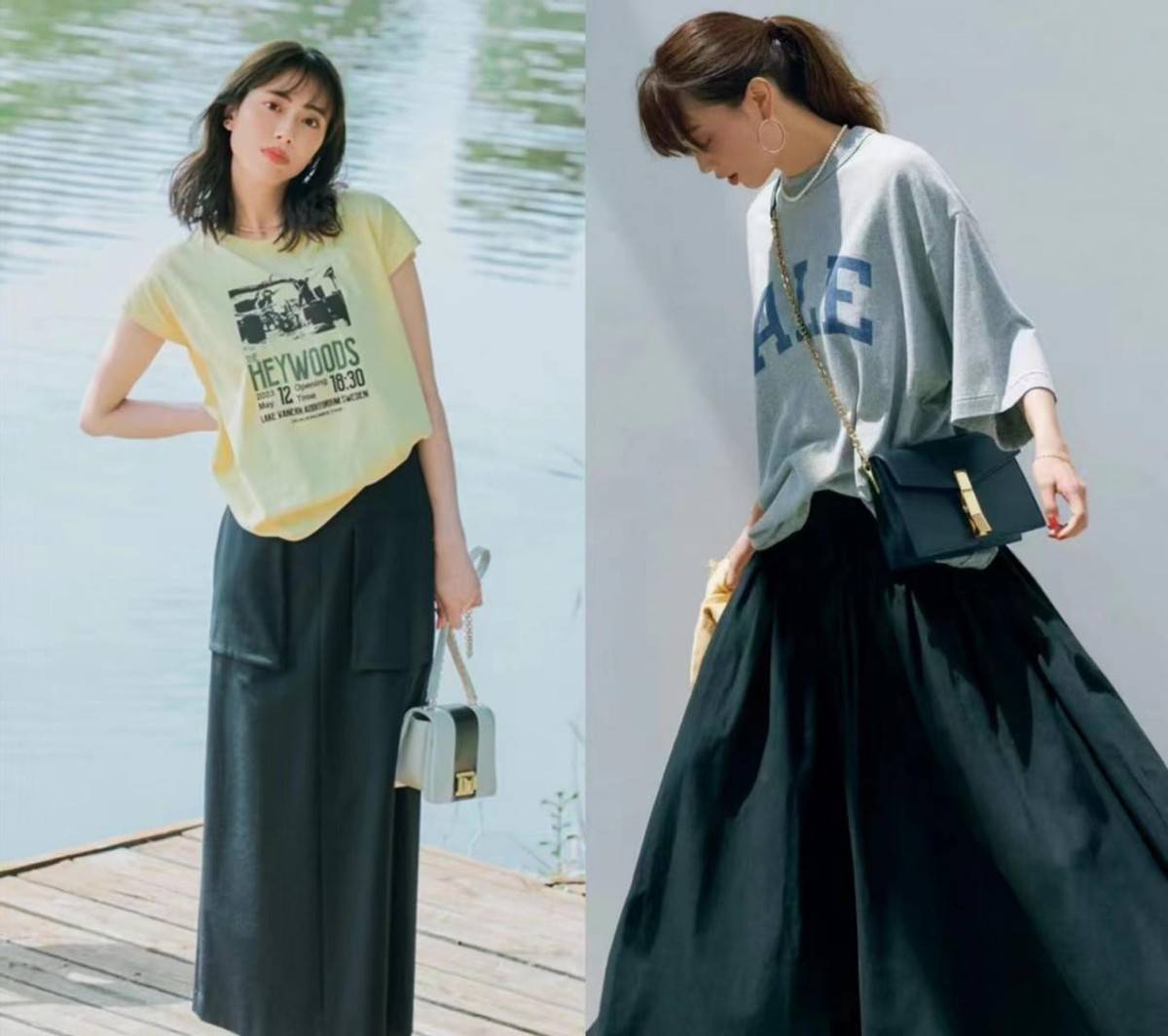 在日系穿搭之中,T恤和半身裙的搭配方式,也拥有很高的出场频率,通过裙子而沉淀出优雅感。