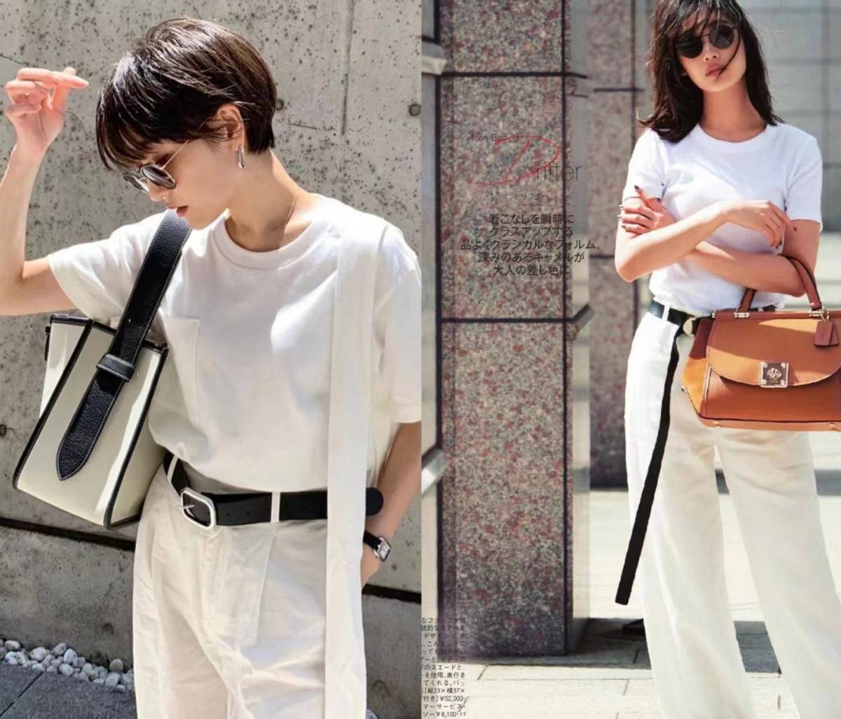 像这两件白色T恤,它们其实都运用了白色长裤进行组合,而且还同时借助黑色皮带,进行腰部线条的明确和展现,就会显得腿很长,防止色彩之间连接起来而模糊了身材比例。