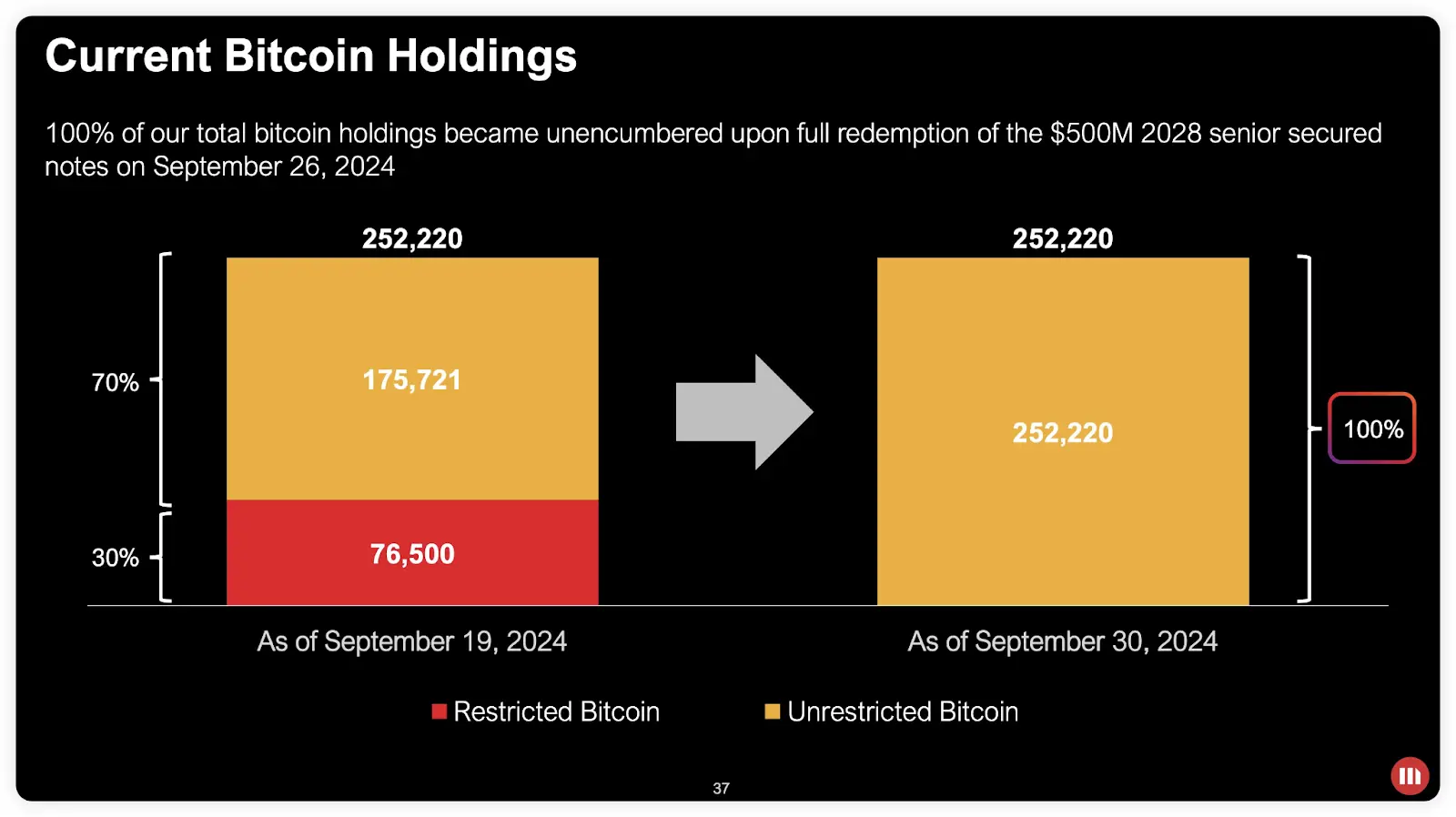 MicroStrategy 发布的财报整体呈现出利好预期。公司计划在未来三年内融资420亿美元,用于继续增持比特币,并已完成对之前质押比特币的回购。截至财报日期,MicroStrategy 共持有252,220枚比特币。自2024年第二季度结束以来,公司新增购入25,889枚比特币,总成本约为16亿美元,平均价格为每枚60,839美元。目前公司总市值约为180亿美元,累计购入比特币的成本为99亿美元,平均价格约为每枚39,266美元。公司还通过A类普通股销售筹集了11亿美元,并通过发行2028年到期的可转换债券再筹集了10.1亿美元,同时偿还了5亿美元的高级担保票据,解除所有比特币资产的抵押。这一举措显著增强了公司的财务灵活性,降低了其在极端市场条件下的风险。