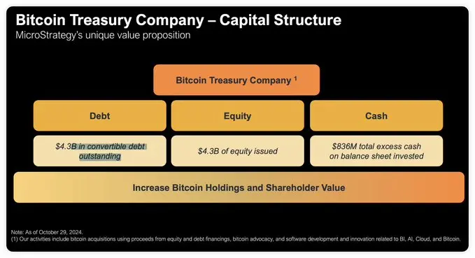 与比特币现货ETF相比,MicroStrategy的独特之处在于其融资方式。ETF投资者需主动购买ETF份额,而MicroStrategy则是通过股权、无抵押或有抵押债务、可转换债券及结构化票据等多种渠道来融资,从而用于直接增持比特币。这一“卖股融资”模式使公司可以主动筹集资金来实现对比特币的长期战略持有。