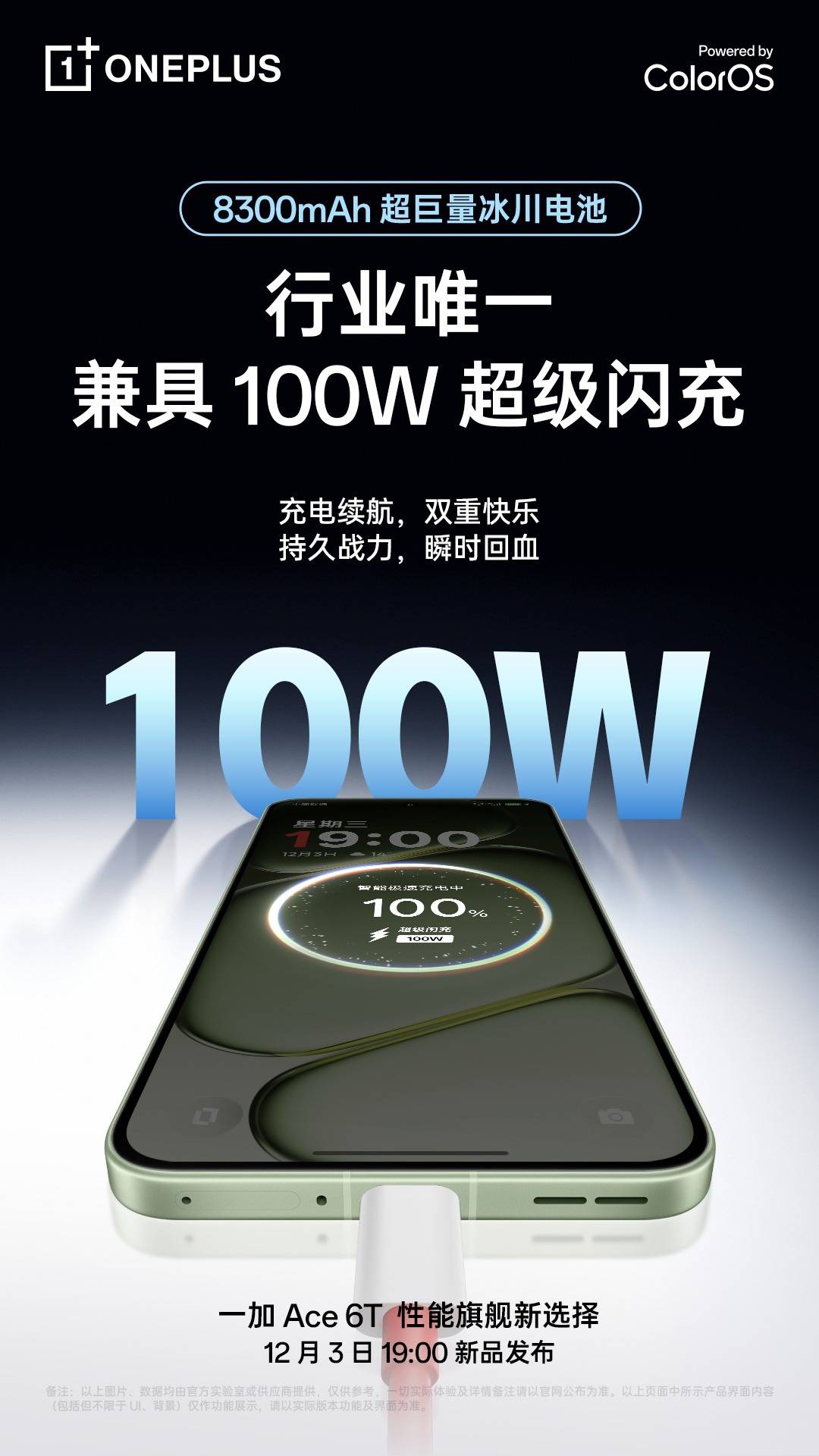 11月28日消息,一加中国区总裁李杰宣布,一加 Ace 6T将全球首发8300mAh超巨量冰川电池,并成为目前电池容量最大的性能旗舰,直接将旗舰续航推入8000+mAh时代。李杰表示,在性能手机领域深耕多年,用户反馈最多的痛点始终是“性能给力但续航不够”,因此Ace 6T在立项之初便设定两大方向:电池必须做到8开头,并且用户出门无需再携带充电宝也能满血使用一整天。