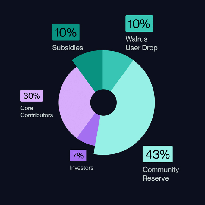 Walrus 的代币经济学设计旨在激励社区参与和生态发展。WAL 代币的分配如下:60% 以上分配给社区,其中 10% 用于用户空投,43% 为社区储备,10% 用于存储补贴;30% 分配给核心贡献者;7% 分配给投资者。